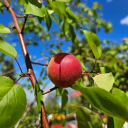 Prunus mandshurica x ‘DurGarfield’ is an open pollinated Manchurian Seedling selected for growing on the prairies. It is a very cold hardy (zone 3) that produces meaty and juicy, smooth tasting fruit, which is great for eating fresh or jams and jellies. Fruit is golden yellow with beautiful red blush and ripens in August. Self fertile, but it is better to plant another variety nearby to pollinate with a different apricot to increase production and yields.