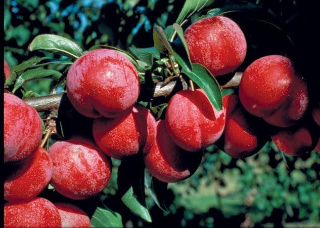 Zone 2 – is a vivid red-skinned plum (4-5 cm diameter) with golden flesh and a waxy bloom on the outside. This plum was developed by Dr. Cecil Patterson at the University of Saskatchewan 60+ years ago, in 1960. Its growth habit is semi-dwarf with weeping branches and the fruit matures in September which is later than most plums. It is a great fresh eating freestone plum with sweet, firm flesh and skin that is not sour. Its top flavour sets it apart from the other hybrid varieties.